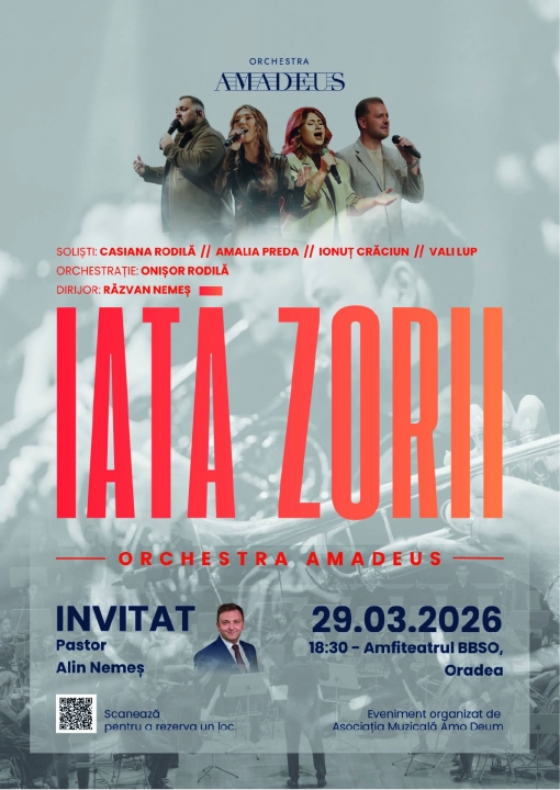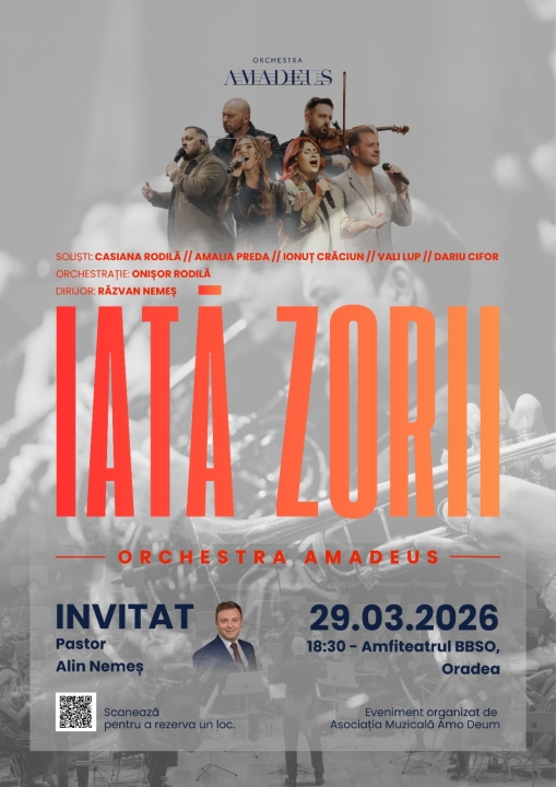 Concert de muzică creștină intitulat IATĂ ZORII susținut de Orchestra Amadeus alături de Casiana Rodilă, Amalia Preda, Vali Lup și Ionuț Crăciun.